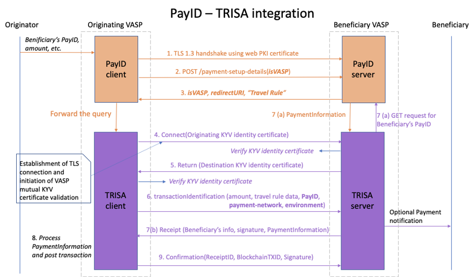 - Upon receiving this Response message, the Sending endpoint (PayID client) parses the message body for isVASP field to check if the Receiving endpoint is a VASP. If it is, the PayID client (Sending VASP) forwards the request to the TRISA client. TRISA client parses the redirectURI field to initiate a secure, mutually authenticated TLS connection between VASPs by the Sending VASP to assure privacy of data in transit using EV KYV identity certificate.