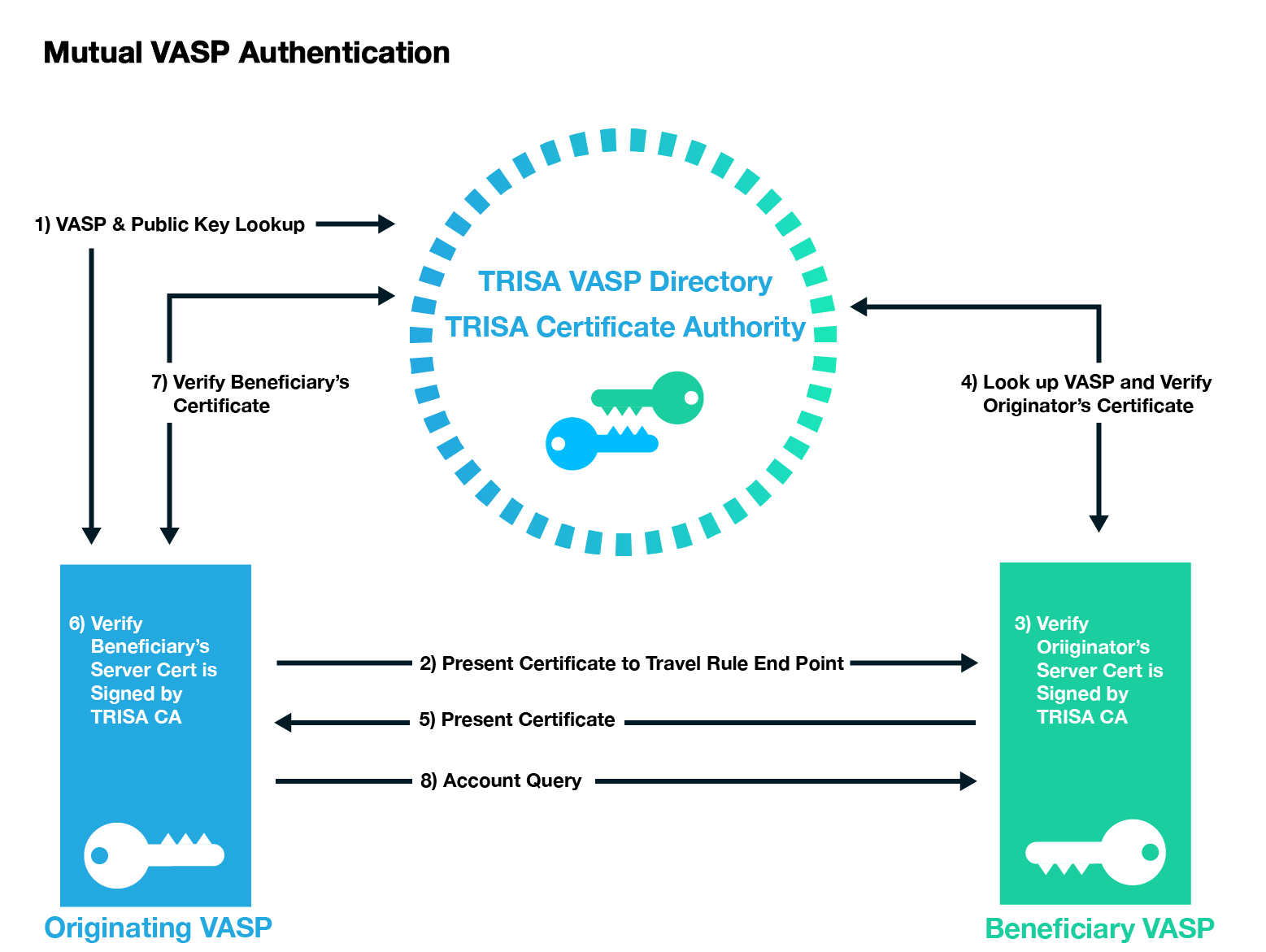 Mutual authentication can be facilitated over the connection protocol by the originating VASP providing their identification certificate to the receiving VASP, which is then verified during the secure communication session establishment and checked for revocation status. In this way, both VASPs are certain the counterparty on the other end of the connection is trusted.