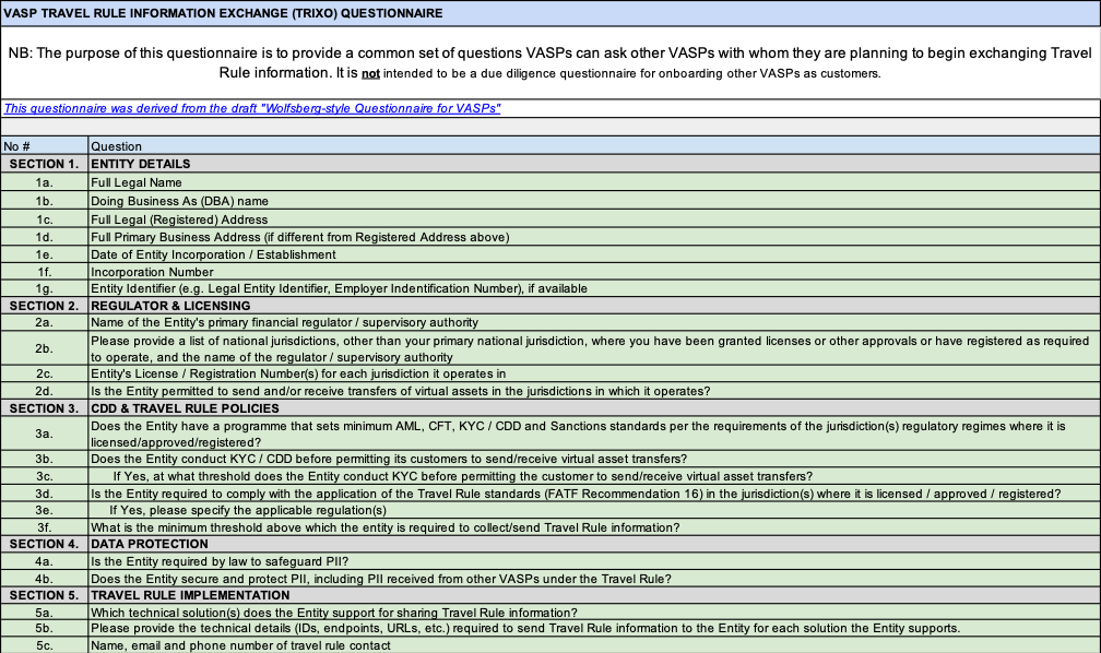 For VASPs that are part of the TRISA Alliance, the directory will also include legal identifiers, privacy protections, and relevant KYC and AML factors from the TRIXA questionnaire. The purpose of the TRIXA questionnaire, developed in collaboration with GDA, is to provide a common set of questions VASPs can ask other VASPs with whom they are planning to exchange Travel Rule information.